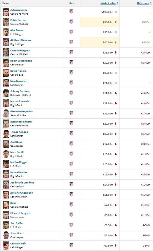 马竞球员身价变更如下:
